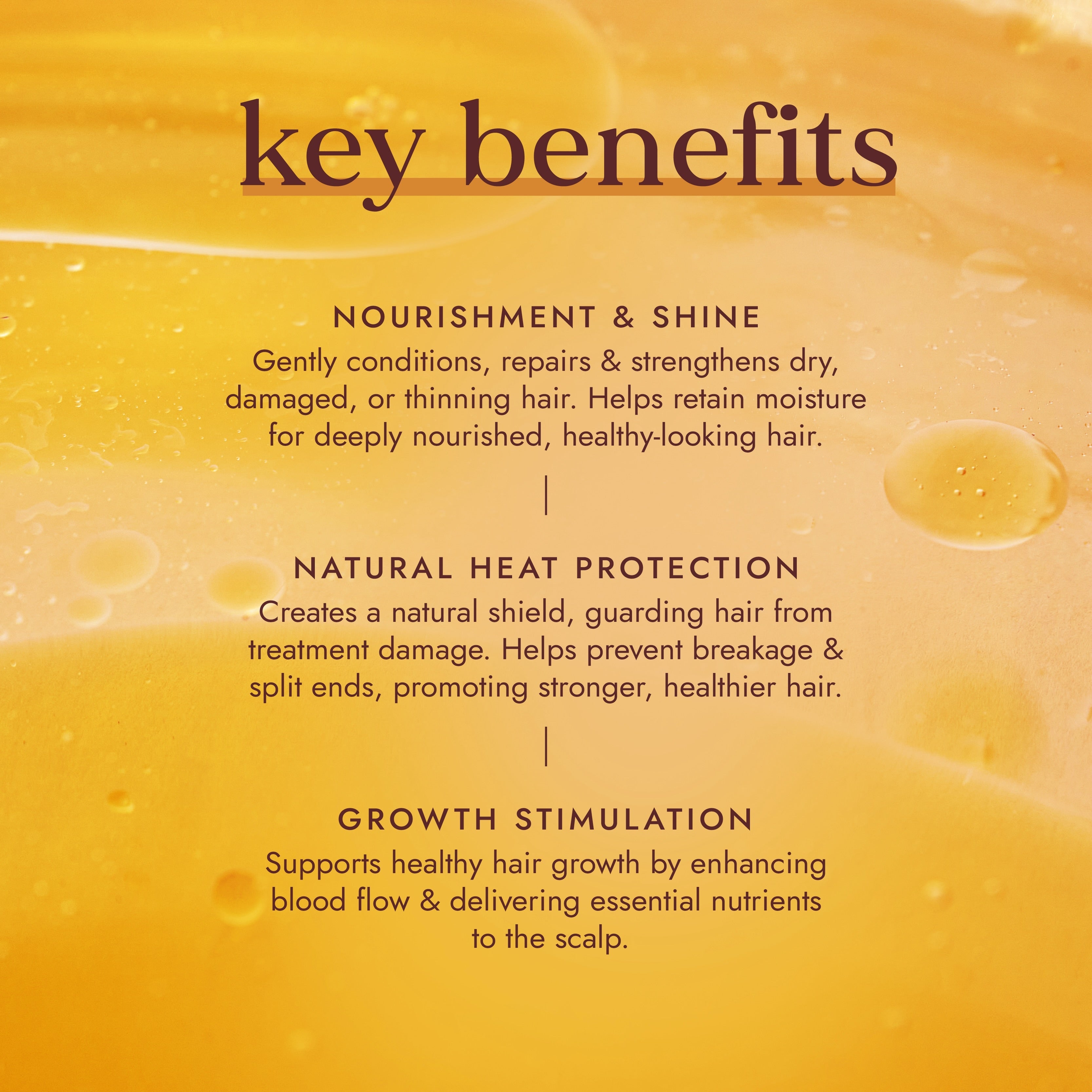 Argan Oil – rich in antioxidants, essential fatty acids & vitamin E to increase hair’s elasticity, to prevent against hair breakage and split ends